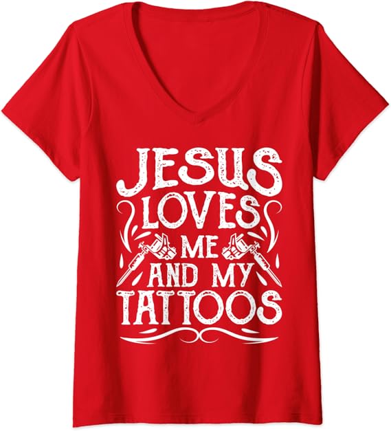 Amazon Com Mujeres Jesus Me Ama Y Mis Tatuajes Tatuados Fe Cristiana Regalo V Camiseta Ropa Zapatos Y Joyeria